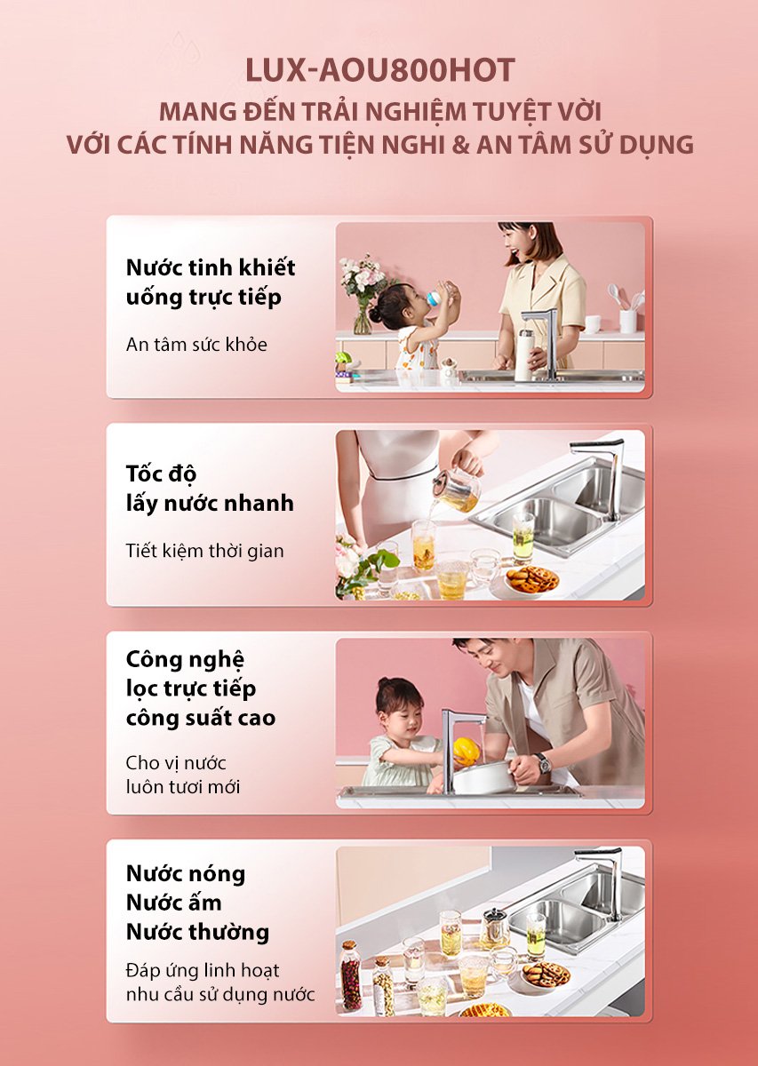 Công suất lọc lớn nhất lên tới 2000 ml/ phút, nước được lọc trực tiếp ngay khi mở vòi đảm bảo luôn tươi mới và đáp ứng nhu cầu sử dụng nước liên tục của đại gia đình.