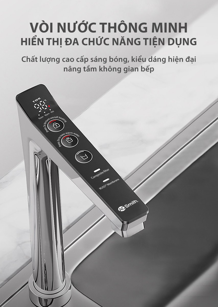 Vòi nước hiển thị nhiệt độ nước nóng, chỉ số TDS, tình trạng lõi lọc và cho phép tùy chọn các chế độ nước, mang đến sự tiện nghi và nâng tầm không gian bếp.