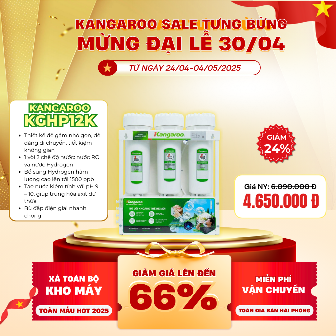 Máy lọc nước Hydrogen Kangaroo KGHP12K có thiết kế gọn nhẹ, là dòng máy để gầm duy nhất cung cấp 2 chế độ nước: nước Hydrogen – nước RO. Với 12 lõi lọc mạnh mẽ, KGHP12K tạo nước khỏe có độ kiềm pH 9 – 10, giúp trung hòa axit dư thừa và loại bỏ các tác nhân oxy hóa nhờ hàm lượng Hydrogen cao.